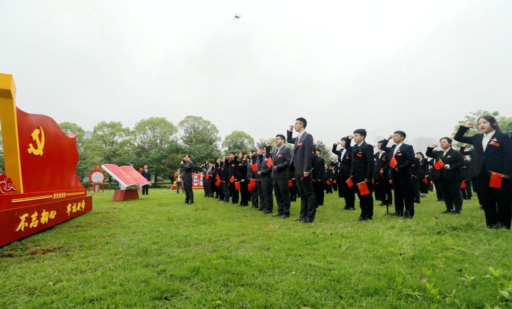 升旗仪式后,全体党员在科研楼南侧草坪在新建成的党史学习教育主题公园,面对党旗庄严宣誓。铮铮誓词既是新党员的承诺,也激荡着老党员的爱党爱国情怀,洪亮的誓言在党史主题公园内久久回响。