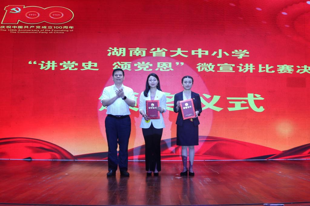 6月19日,由省教育厅主办的湖南省大中小学“学党史颂党恩”微宣讲比赛决赛在湖南师范大学举行。我校青年教师李文术在比赛中获特等奖。