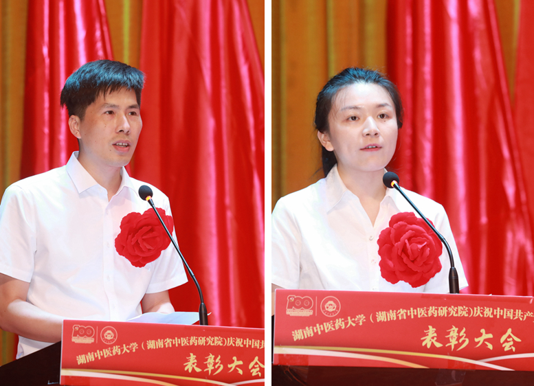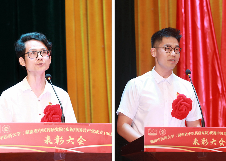 省教育系统优秀党务工作者、医学院第一职工党支部副书记唐群同志,校(院)优秀共产党员代表、马克思主义学院教师李文术同志,校(院)优秀党务工作者代表、研究院团委书记、研究院附属医院人事科科长熊宇杰同志,校(院)优秀共产党员学生代表、针灸推拿与康复学院2020级博士冯祥同志作为受表彰代表分别发言。