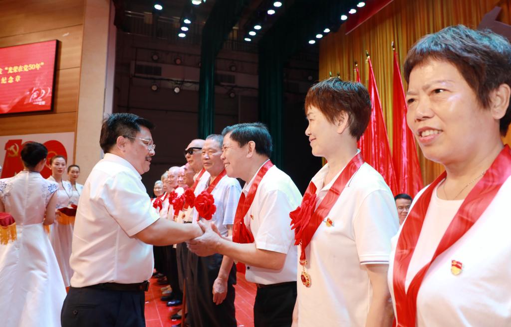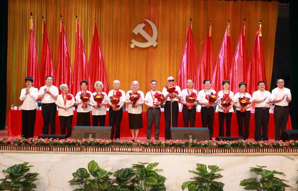表彰大会在雄壮激昂的国歌声中拉开序幕。校(院)党委书记秦裕辉、校(院)长戴爱国、校(院)党委副书记易刚强、校(院)纪委书记张玉芬为“光荣在党50年”老党员代表颁发纪念章。老党员们是校(院)发展取得卓越成就的参与者、奉献者和见证者,此次颁发“光荣在党50年”纪念章,是对他们不忘初心、牢记使命,勇攀高峰、永葆青春的褒奖和集体致敬。