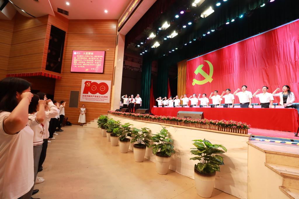 新发展党员代表及全体与会党员宣读入党誓词,原湖南中医学院党委副书记、副院长、正厅级干部柳树诚同志,百千万人才工程国家级人选、药学院副院长王炜同志,学生党员代表陈雅熙同志领誓。
